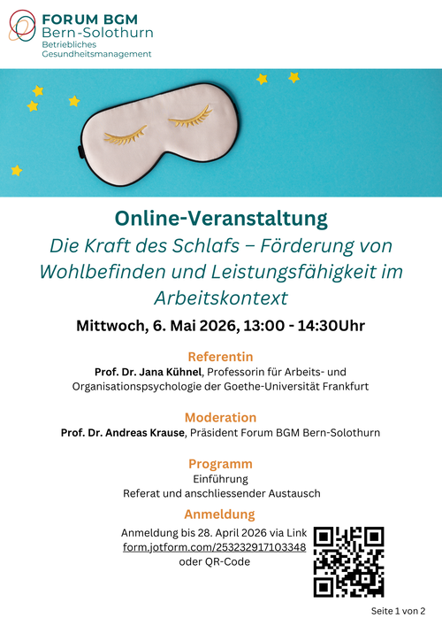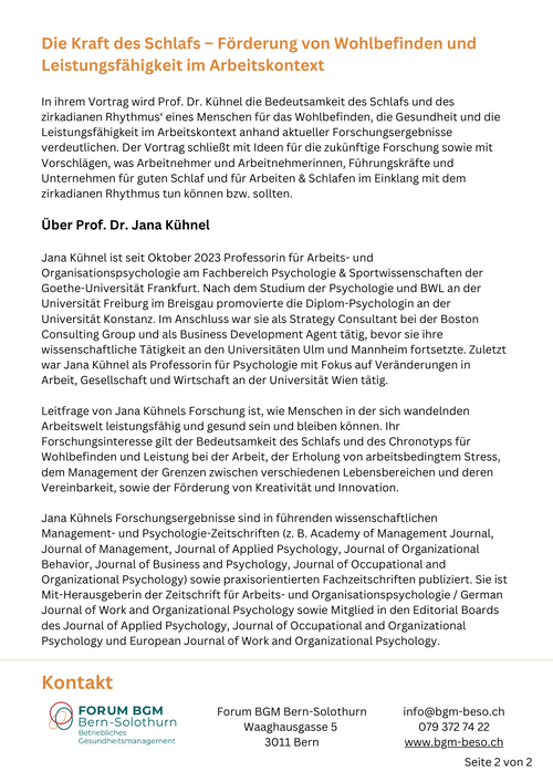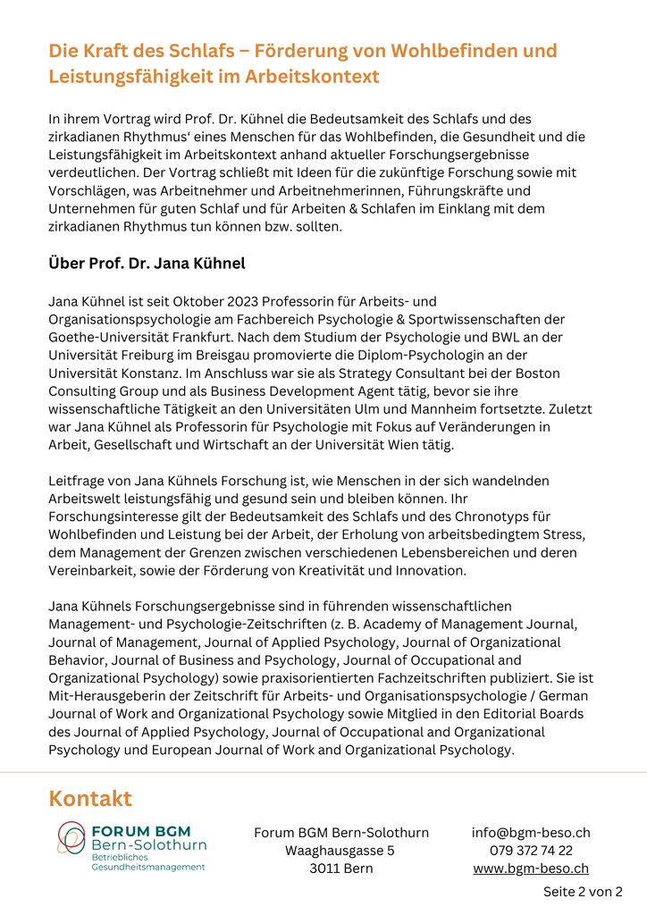 In ihrem Vortrag wird Prof. Dr. Kühnel die Bedeutsamkeit des Schlafs und des zirkadianen Rhythmus‘ eines Menschen für das Wohlbefinden, die Gesundheit und die Leistungsfähigkeit im Arbeitskontext anhand aktueller Forschungsergebnisse verdeutlichen. Der Vortrag schließt mit Ideen für die zukünftige Forschung sowie mit Vorschlägen, was Arbeitnehmer und Arbeitnehmerinnen, Führungskräfte und Unternehmen für guten Schlaf und für Arbeiten & Schlafen im Einklang mit dem zirkadianen Rhythmus tun können bzw. sollten.